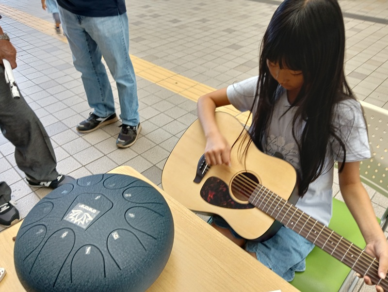ストリートピアノだけでなく、お子様にはタングドラムで「めだかの学校」や「夏の思い出」、「きらきら星」も楽器体験で演奏してもらいました。ジャズ祭り当日も「クロスロード会場」(レストハウス前無料エリア)で大人も参加できる楽器体験コーナーがあるので、気軽にご参加ください。