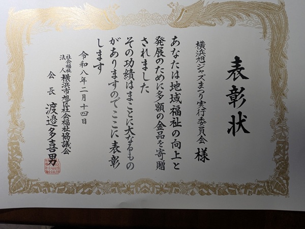 横浜旭ジャズまつり実行委員会は、長年、コンサートチケット寄付により、団体代表として表彰状を受け取りました。